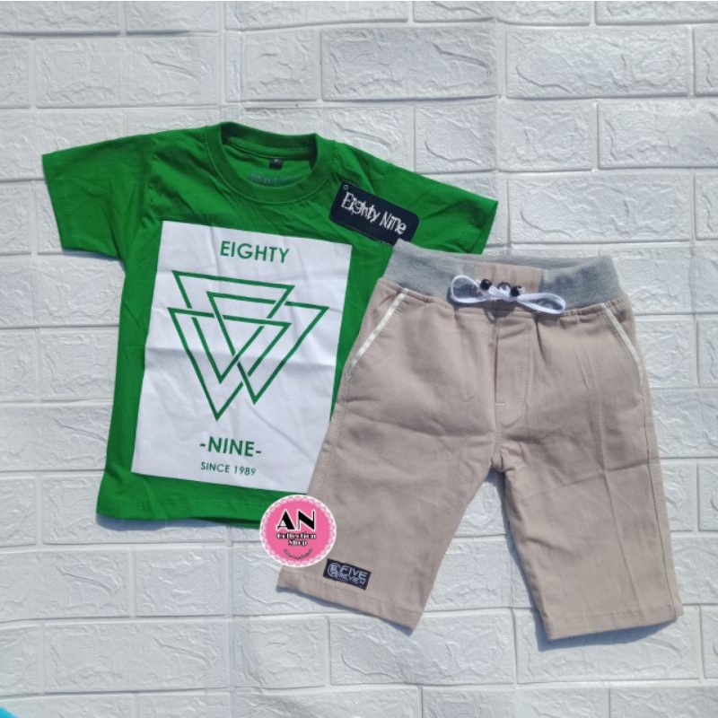 setelan kaos anak distro / setelan baju anak laki-laki / setelan anak kaos chinnos hijau SEGITIGA EIGHTYNINE