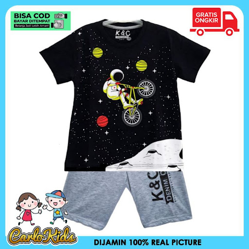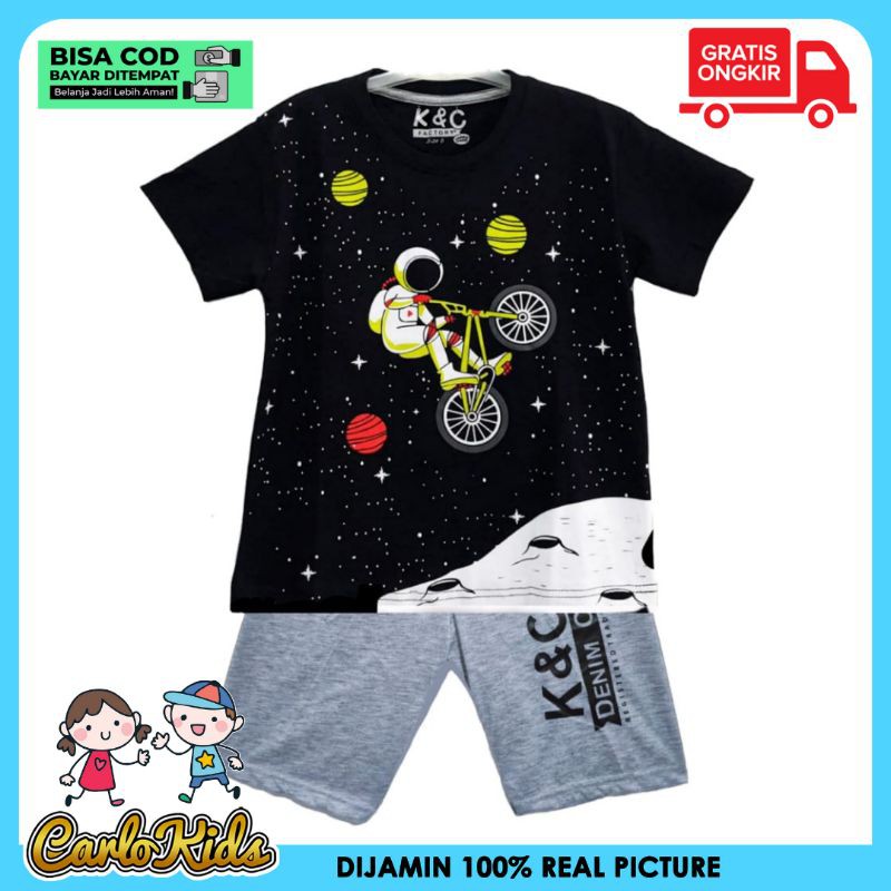 Harga CarloKids Baju Anak / Kaos SETELAN Anak Laki-Laki Motif Astronot BLACK + GREY 1-10 Tahun