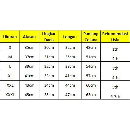 Produk ini memiliki 6 Variasi Ukuran yaitu : S (1-2th),M (2-3th),L (3-4th),XL (4-5th),XXL (5-6th),3XL (6-7th),