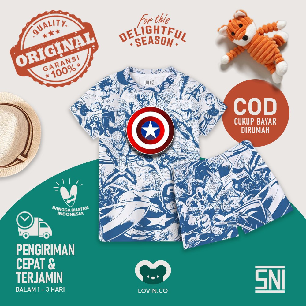 [Lovin.co] Setelan Baju Anak Laki Laki dan Perempuan Stelan Kaos Anak Cowok dan Cewek Full Print Garis Motif Marvel 1 2 3 4 5 Tahun