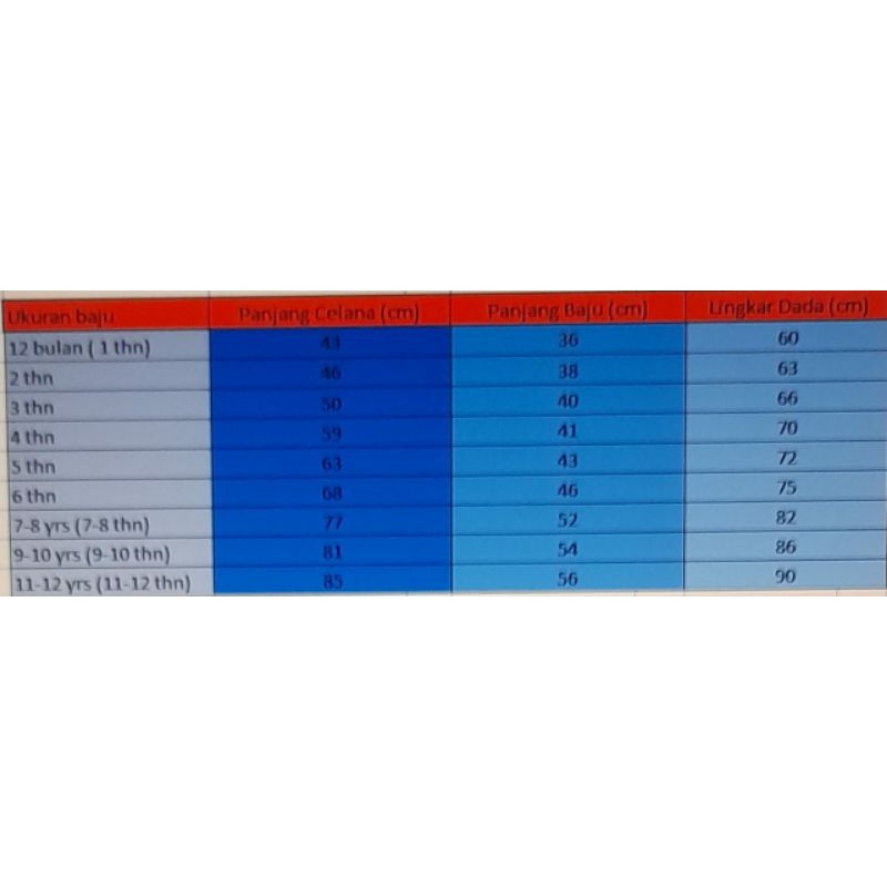 Produk ini memiliki 9 Variasi Ukuran yaitu : 1 thn,2 thn,3 thn,4 thn,5 thn,6 thn,7-8 tahun,9-10 tahun,11-12 tahun,