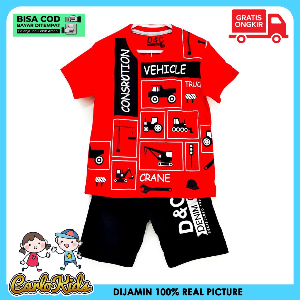 CarloKids Baju Anak / Kaos Setelan Anak Laki-Laki Motif Crane Vehicle Red 1-10 Tahun