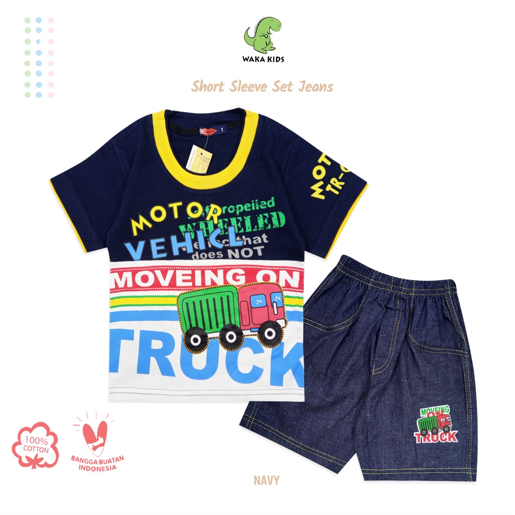Wakakids Baju Anak Laki Laki Usia 1 - 4 Tahun Setelan Ce;ana Jeans Motif Truck Horton 2127