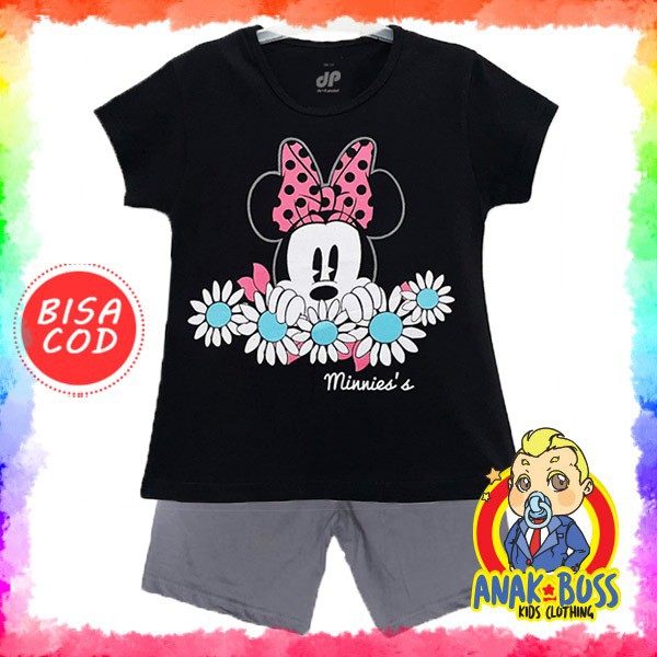 Setelan Kaos Anak Perempuan / Baju Anak Perempuan Lengan Pendek Motif Minnie Mouse Black 1-10 Tahun - AB